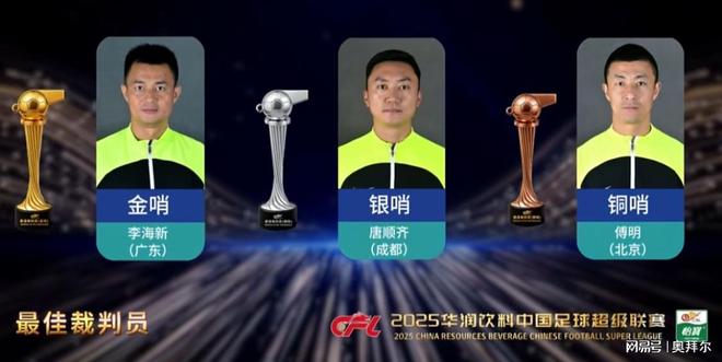 在周五进行的中足联颁奖典礼上,李海新当选2025赛季最佳裁判员。著名记者肖赧透露,“评选部门还内部反复了一番”。在第一轮上海申花对阵长春亚泰一战,蒋圣龙踩踏亚泰门将,李海新并未第一时间做出判罚,在视频助理裁判介入之后出示黄牌。然而,足协评议认为,李海新应该向蒋圣龙出示红牌。在武汉三镇对阵青岛海牛一战,萨里奇故意踩踏帕拉西奥斯小腿,李海新并未出示红牌,足协评议认为李海新判罚错误,应该向萨里奇出示红牌。记者李璇,“今年的金哨还行,至少今年的执法没有什么太大争议。”博主卖萌谁在行则透露,“金哨李海新,银哨唐顺齐,这个组合还是挺有杀伤力的”肖赧透露,“据说这个结果产生前,评选部门还内部反复了一番。中超裁判们需要努力,争取明年在诸如争冠/保级关键战和足协杯决赛这类重大赛事中扮演主角,不要动不动就被洋哨抢走执法机会!”程文莉指出,“这份名单出来,肯定会招来不少吐槽吧?李海新曾因误判而被足协内部处罚。唐顺齐执法4场比赛就发了5张红牌,其中3张给山东泰山,京鲁大战10分钟内罚下泰山两名球员,虽足协支持部分红牌判罚,但球迷质疑其判罚尺度过严。”陈华则表示,“首先祝贺2025中超金哨李海新老师,不过从中国足协裁判评议结果看,业务能力还是需要不断提升,毕竟学无止境,再说裁判本身就是一个犯错的职业,克里纳也会犯错,别说现在var时代,确实中超不好吹。”