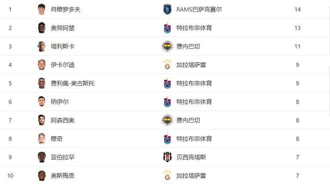 算上本场比赛的进球,本赛季土超射手榜上,肖穆罗多夫以14球继续领跑,要知道在这位乌兹别克斯坦锋霸身后是昔日国米队长伊卡尔迪(9球)和那不勒斯曾经的大腿奥斯梅恩(7球),这两位曾在意甲风光无限的金靴得主,现在在土耳其的赛场上竟被一位“意甲弃将”远远甩开。